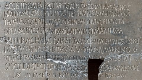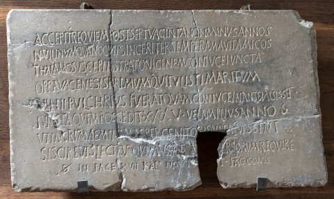 - Accepit requiem post septuaginta non minus annos / nulli numquam nocuit sinceriter semper amavit amicos / thalamo suscepit Stratonicenem coniuge(m) iuncta(m) / o prava genesis primum(!) qui(!) tulisti maritum / nihil pulchrius fuerat quam coniuge(m) in ante misisset / iuncta quem possedit XXXV vel amplius annos / ut lacrimae minimae(!) per genitoris vita(m) fuissent / si scire vis lector qui pausat ca[pita] versorum require / d(efunctus) in pace XVII Kal(endas) Nov(embres) N[epot(iano)] et Fac(undo) conss(ulibus)