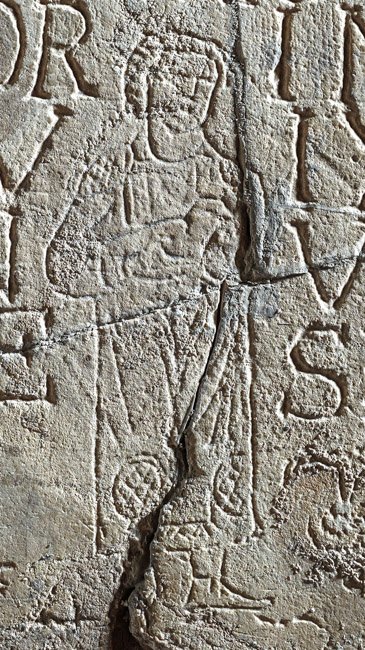 - Unter und innerhalb der Inschrift Ritzzeichnung: stehender Knabe mit Taube in den Händen, neben den Füßen je eine Taube.