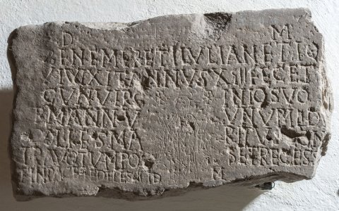 - D(is) M(anibus) / bene mere(n)ti Iulianeti q/ui(!) vixit annus(!) XVIII fecet(!) / cun(!) virginio suo / p(lus) m(inus) annu(m) unu(m) m(enses) II d(ies) [---] / dolie(n)s maritus con/tra votum pos(u)et(!) recess[it] / in pace fedelis(!) II Id(us) M()