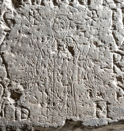 - Unten innerhalb der Inschrift Ritzzeichnung: Orantin, seitlich des Kopfes je ein Christogramm, seitlich der Hüften je eine Taube auf Zweig.