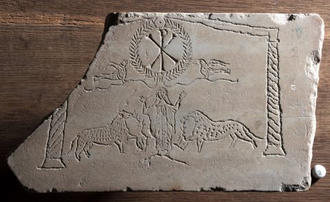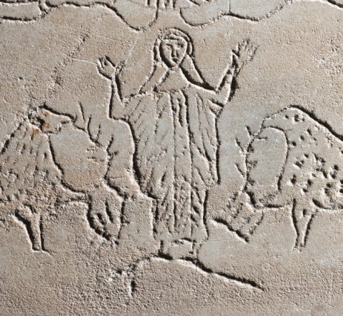 23589 Grabplatte mit Orantin zwischen Schafen und Vögeln