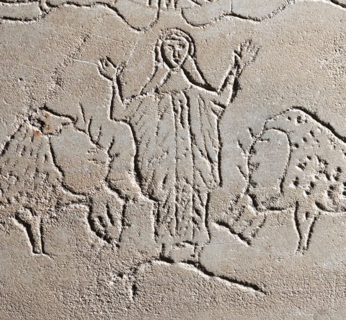 23589 Grabplatte mit Orantin zwischen Schafen und Vögeln