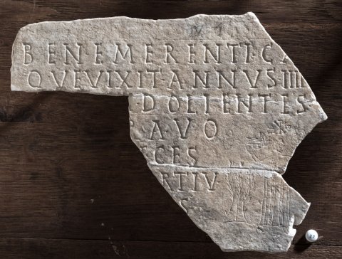 - Benemerenti Ca[---] / qu(a)e vixit annus(!) IIII [m(enses) --- d(ies) --- pa/rentes] dolientes [feceru/nt cont]ra vo[tum ---] / [---r]eces[sit ---] / [--- te]rtiu [---] / [---]s[---]
