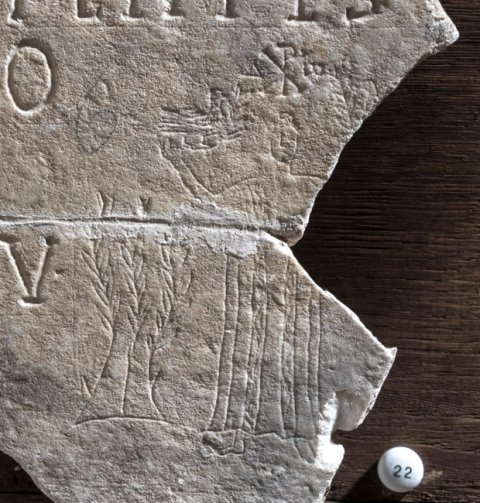 - unten innerhalb der Inschrift Ritzzeichnung: Orant zwischen Bäumen, seitlich des Kopfes Tauben, über dem Kopf Christogramm