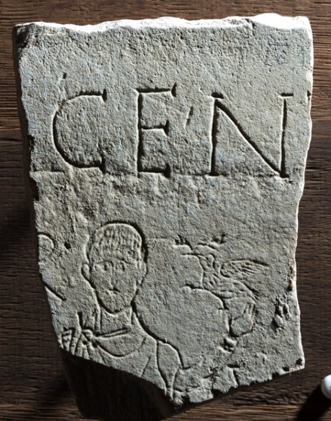 - Ritzzeichnung: Oberteil eines bärtigen Mannes (Orant) mit Zwiebelknopffibel auf der rechten Schulter. Links Christogramm, rechts Taube mit Zweig.