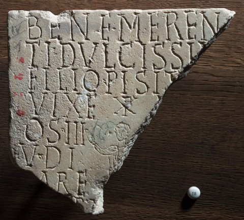 - Bene meren/ti dulcissim[o] / filio Pisit[--- q(ui)] / vixet(!) [ann]/os III [menses] / V di[es ---] / [p]are[ntes] / [con]tra [votum ---