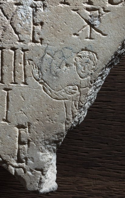 - unten innerhalb der Inschrift Ritzzeichnung: Orant, über dem Kopf Christogramm