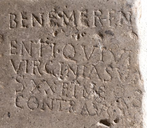 - Bene meren[ti ---]/enti qui vi[xit cum] / virginia sua [anno]/s XX et me[nses ---] / contra vo[tum pos(uit)]