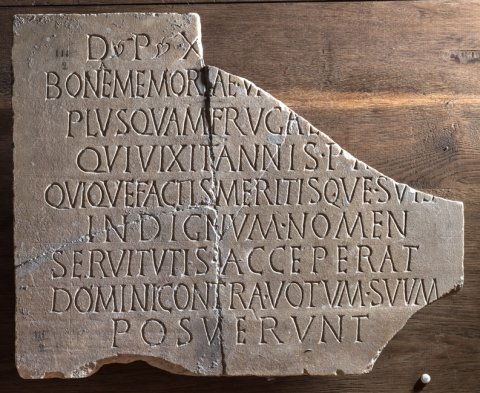 - D(e)p(ositus) X[---] / bonae memoriae Vi[---] / plus quam frugal[is ---] / qui vixit annis p(lus) m(inus) [---] / quique factis meritisque suis / indignum nomen / servitutis acceperat / domini contra votum suum / posuerunt