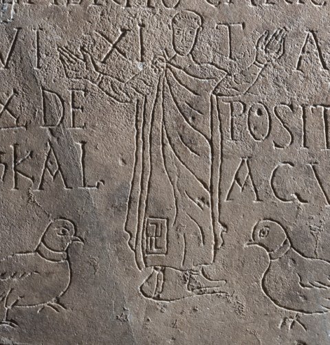 Innerhalb der Inschrift Ritzzeichnung: Orant mit Fibel auf der rechten Schulter, am Mantelsaum Feld mit Swastika. Neben den Füßen je eine Taube.