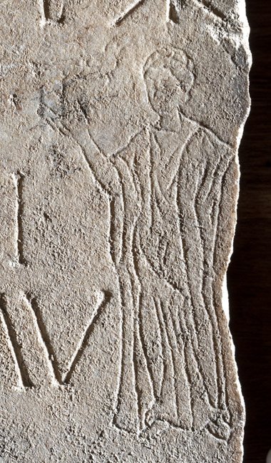 - unten innerhalb der Inschrift Ritzzeichnung: Orantin, über dem Kopf Christogramm