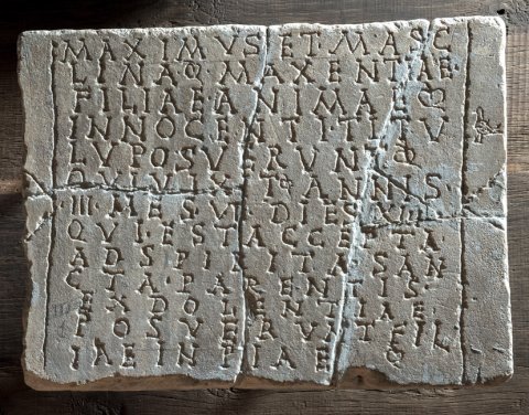 - Maximus et Masc/lina Maxentiae / filiae animae / innocenti titu/lu(m) posuerunt / qui(!) vixit annis / III me(nsibu)s VI die(bu)s XIII / qui est accepta / ad spirita(m) san/cta(m) parentis(!) / ex dolentiae / posuerunt fil/iae inpiae