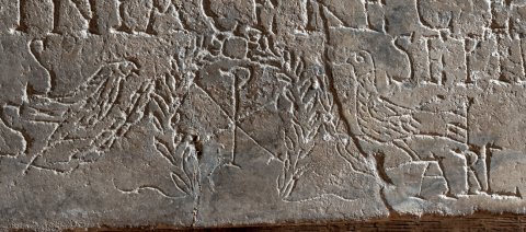 - Unter der Inschrift Ritzzeichnung: Christogramm in Kranz, flankiert von Tauben.