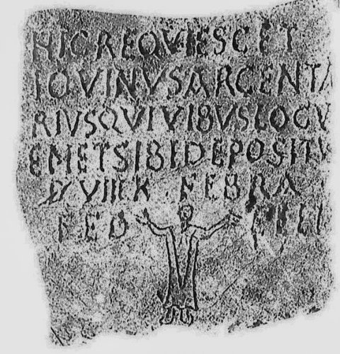 - Hic requiescit / Iovinus argenta/rius quia vibus(!) locu(m) / emet sibi depositu(s) / die VIII K(alendas) Febr(u)a(rias) / fedelli(s)(!)