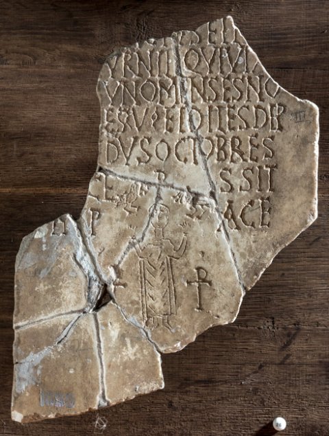 - Unten innerhalb der Inschrift Ritzzeichnung: Orant, seitlich je ein Christogramm, über dem Kopf Christogramm zwischen Tauben.
