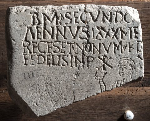 - B(onae) m(emoriae) Secundo qui vixit / aennus(!) LXXX me[nses ---] / receset(!) nonum K(alendas) D[ecembres] / fedelis(!) in p[ace]