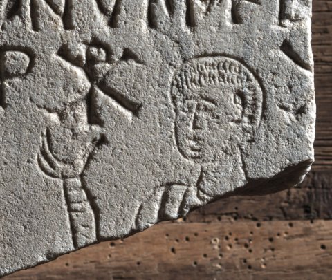 - Unter der Inschrift Ritzzeichnung; Orant, seitlich des Kopfes je ein Christogramm, weiter unten Taube mit Zweig.
