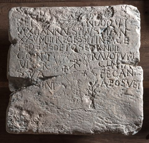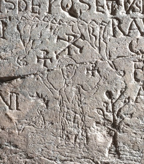 - Unten innerhalb der Inschrift Ritzzeichnung: Orant zwischen Taube und Baum, um den Kopf drei Christogramme, darüber geöffneter Vorhang.