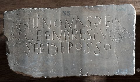 - seitlich der Inschrift Ritzzeichnung: je eine Taube mit Efeublatt