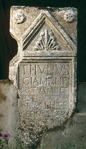 - Ti(berius) Iulius / Giamilli f(ilius) / Sextus miles / coh(ortis) montan(orum) / stip(endiorum) XL h(ic) s(itus) e(st) / et Ingenuae / [fi]liae v[ix(it) --- ] / Iulia Se[xti] / lib(erta) A[--- ]