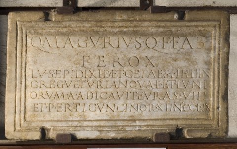 - Q(uintus) Magurius Q(uinti) f(ilius) Fab(ia) / Ferox / lus(it) epidixib(us) et ceta{e}s(tis) I II III in / greg(e) Veturian(a) quae et Iuni/orum A(quis) A(poni) dicavit euras VIII / et pertic(am) uncinor(um) XII n(umero) CCLIX