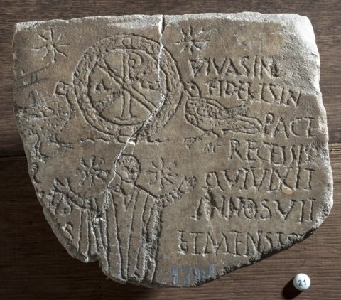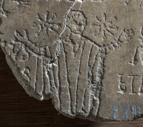 - links von der Inschrift Ritzzeichnung: Orant, seitlich des Kopfes je ein Stern, über dem Kopf Kranz mit Christogramm, flankiert von Tauben und Sternen