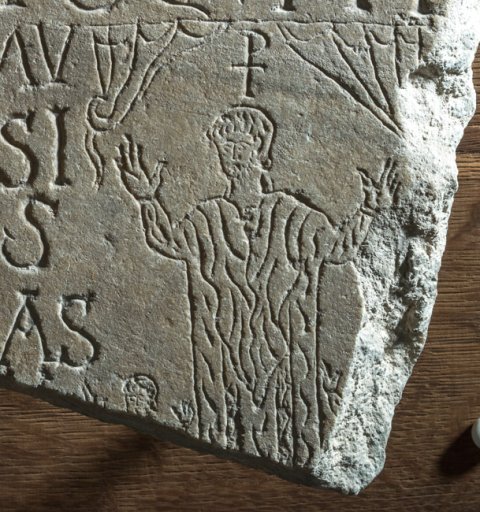 - Unten innerhalb der Inschrift Ritzzeichnung: Orant, über dem Kopf Christogramm zwischen geöffneten Vorhängen, unten Reste von zwei kleinen Oranten.