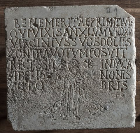 - Bene meritae Primitiv(a)e / qui(!) vixit an(nos) XLV m(enses) VII d(ies) XV / virginius suos(!) dolies / contra votum posuit / recessit in paca(!) / fidelis Nonis / Octobris(!)
