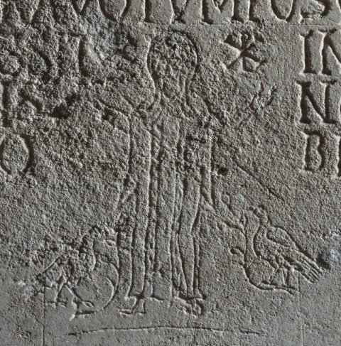 - unten Ritzzeichnung: Orantin zwischen Tauben mit Zweig, neben dem Kopf je ein Christogramm