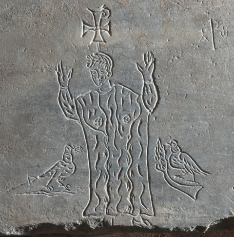 - Ritzzeichnung: Orant zwischen Tauben mit Zweig, über dem Kopf Christogramm, seitlich je ein kleines Christogramm mit Alpha und Omega. Rechts zwei vertikale Linien (Rahmen des Schriftfeldes ?).