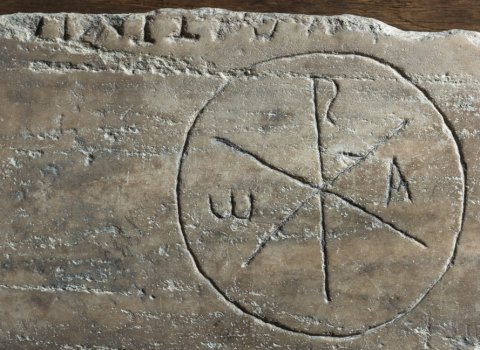 - Ritzzeichnung: Kreis mit Christogramm zwischen Omega und Alpha