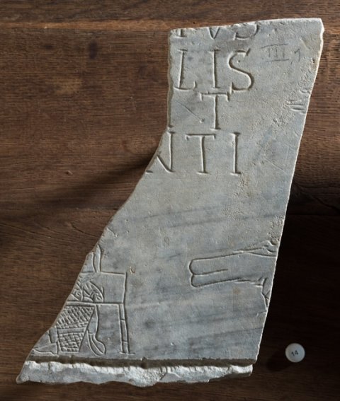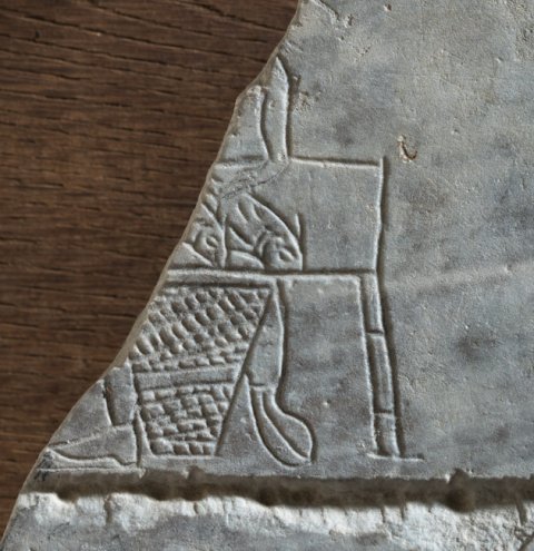 - Unter der Inschrift Ritzzeichnung: an einem Tisch sitzender Mann, auf dem Tisch Fische, unter dem Tisch Korb. Weiter rechts Schwanz einer Taube.
