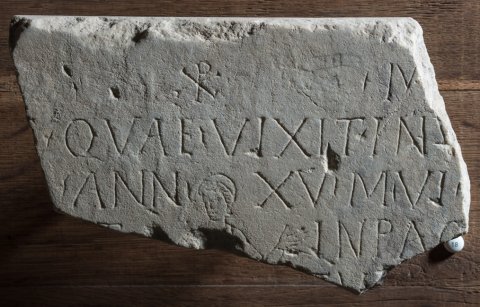 - [B(onae)] m(emoriae) / [---] quae vixit inv[---] / ann(os) XV m(enses) VI [d(ies) ---] / [pausa]t in pac[e ---] /[---