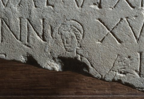 - über der Inschrift Christogramm, innerhalb der Inschrift Ritzzeichnung (Orantin)