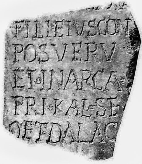 - ---] / [---]X di(es) XV[---] / fili(i) eius con[tra vot(um)] / posueru[nt ---] / et in arca [condiderunt] / pri(die) Kal(endas) Se[pt(embres) Gratia]/[n]o et Dalac[aifo(!) co(n)s(ulibus)]
