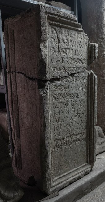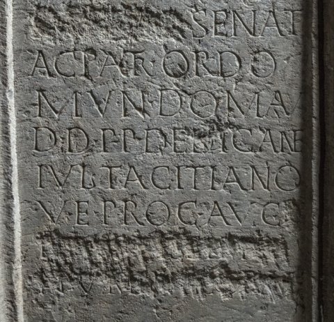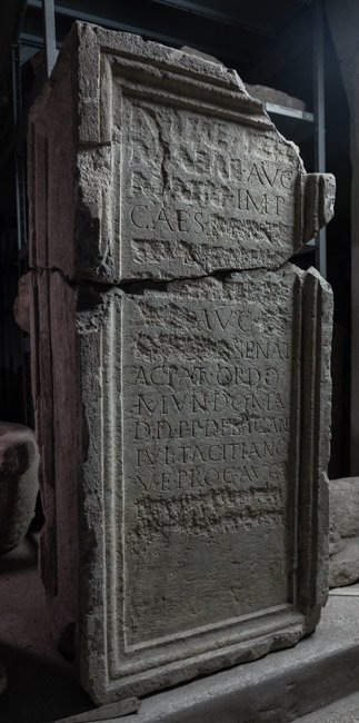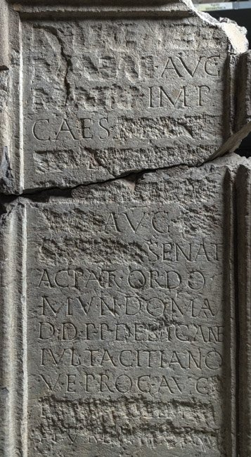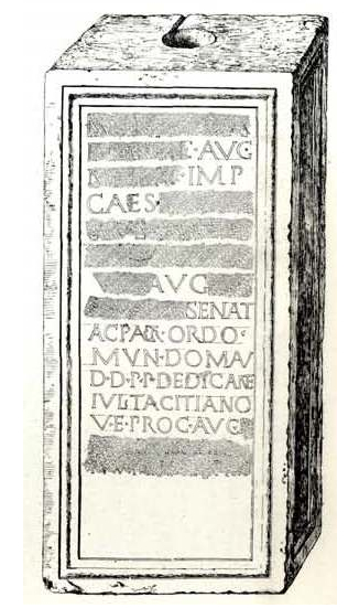 - [[[Iuliae Ma]]]/[[maeae Aug(ustae)]] / [[matri]] Imp(eratoris) / Caes(aris) [[M(arci) Aur(eli)]] / [[Seve[ri Alexa]]]/[[n[dri P]ii [Fel(ici) in]]]/[[v[ic(ti)]]] Aug(usti) [[e[t]]] / [[[castr(orum) e]t]] senat(us) / ac patr(iae) ordo / mun(icipii) Domav(ianorum) / d(ecreto) d(ecurionum) p(ecunia) p(ublica) dedicante / Iul(io) Tacitiano / v(iro) e(gregio) proc(uratore) Aug(usti) [[[n(ostri)]]] / [[devotissimo]] / [[numini eorum]]