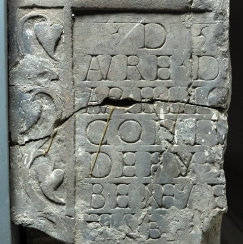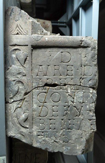 - Schriftfeld mit Efeuranke auf den seitlichen Rahmenleisten. Darüber Reste eines Bildfeldes mit ornamentiertem Rahmen.