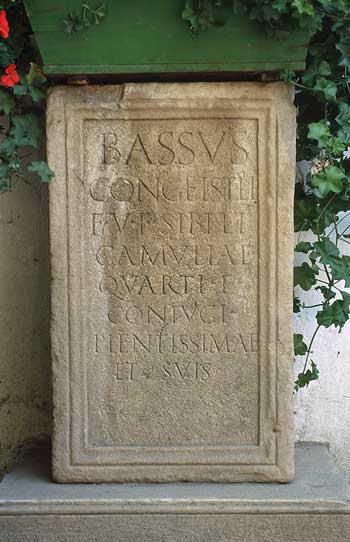 - Bassus / Congeistli f(ilius) / v(ivus) f(ecit) sibi et / Camuliae / Quarti f(iliae) / coniugi / pientissimae / et suis