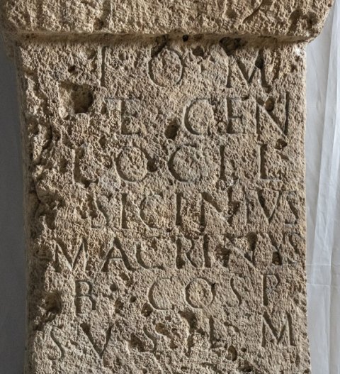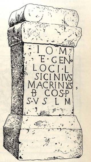 - I(ovi) O(ptimo) M(aximo) / et Genio / loci L(ucius) / Sicinius / Macrinus / b(ene)f(iciarius) co(n)s(ularis) P(annoniae) / s(uperioris) v(otum) s(olvit) l(ibens) m(erito)