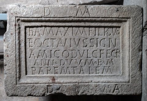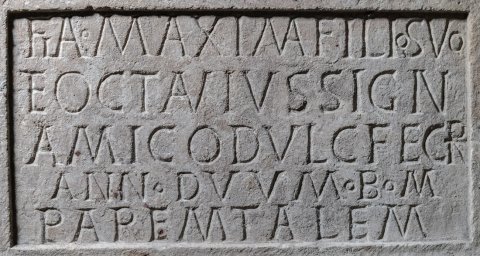 - D(is) M(anibus) // Fla(vio) Maxima filio suo / et Octavius sign(ifer) / amico dulc(issimo) fecer(unt) / ann(orum) duum b(ene) m(erenti) / paremtalem(!) // d(olente) a(nimo)