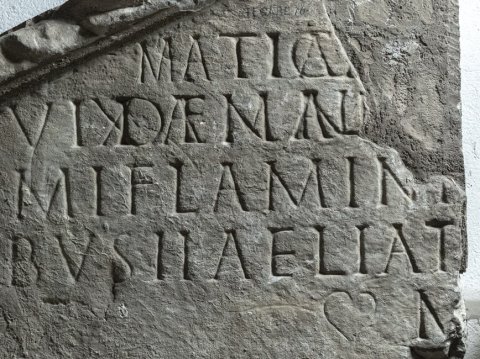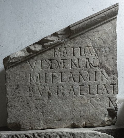 - --- procuratori] arg(entariarum) Del/matica[rum --- qui ob honorem] magistratus / dena[rios --- et ---]o filio dec(urioni) col(oniae) Sir/mi(ensium) flamini [--- qui vixit] annis XXII mensi/bus II Aelia T[--- marit]o et filio karissi/m[is bene? merentibus? ---? fe]cit