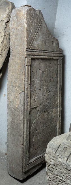 - Eingeschriebener Giebel mit Kreisrosette (Ritzzeichnung), Schriftfeld zwischen stilisierten Pilastern, unterhalb der Inschrift zwei Torques (?).