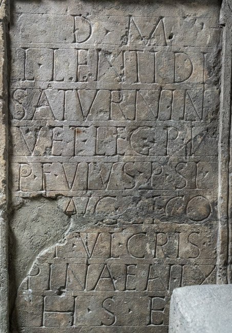 - D(is) M(anibus) / L(uci) Lentidi / Saturnini / vet(erani) leg(ionis) p(rimae) M(inerviae)(?) / p(iae) f(idelis) vi(v)us p(osuit) sib(i) / [--]AV(?)G(?) et co/ni(ugi) Ul(piae) Cris/pinae an(norum) LX / h(ic) s(ita) e(st)