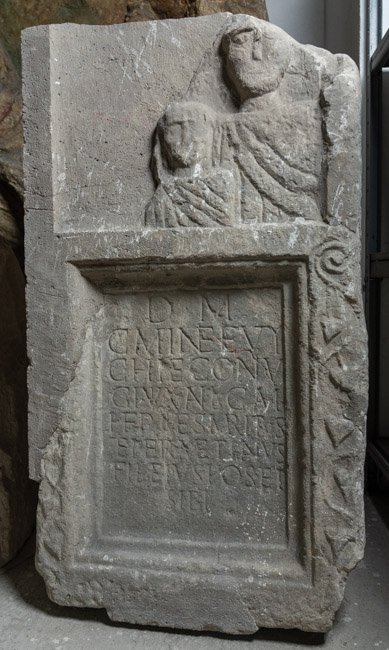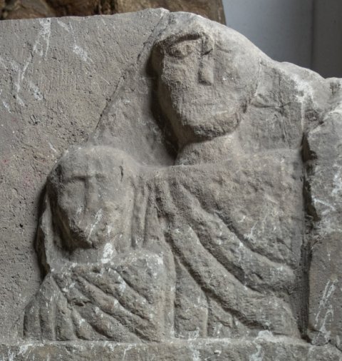- Über der Inschrift Bildfeld mit Brustbildern einer Familie: Ehepaar mit Kind (Knabe) im Sagum. Frau weggebrochen, in der Mitte Sohn, rechts Mann. Auf der Rahmenleiste des Schriftfeldes Efeuranke.