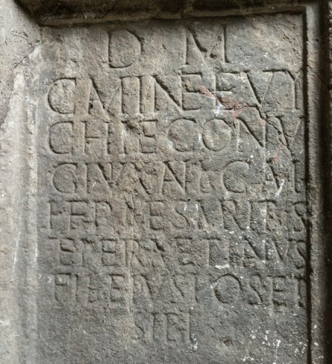 - D(is) M(anibus) / Camini(a)e Euty/chi(a)e coniu/gi vix(it) an(nos) L Cam(inius) / Hermes maritus / et Hermetianus / fil(ius) eius pos(uerunt) et / sibi