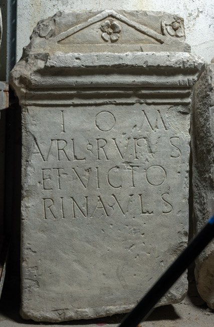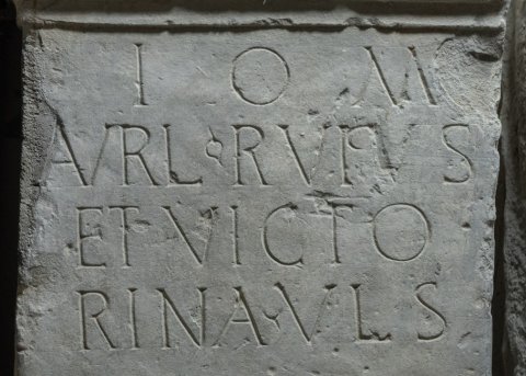 - I(ovi) O(ptimo) M(aximo) / Aur(e)l(ius) Rufus / et Victo/rina / v(otum) l(ibentes) s(olverunt)