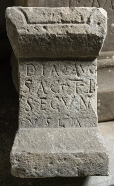 - Dia(nae) Aug(ustae) / sac(rum) T(itus) Fl(avius) / Secun(dus?) / v(otum) s(olvit) l(ibens) m(erito)
