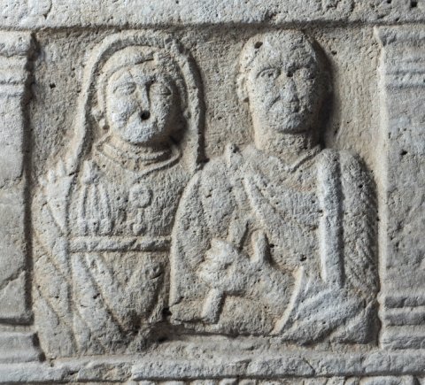 - Eingeschriebener Giebel mit Rosette, Bildfeld zwischen Pilastern: Ehepaar, links einheimische Frau mit Schleier, Halsband mit Lunula, Gürtel, rechts bärtiger Mann im Sagum mit Fransen und Bügelfibel, in der Linken Stab oder Rolle (volumen) ? Auf der Rahmenleiste des Schriftfeldes Weinranken.