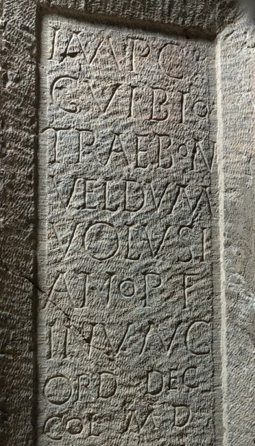 - Imp(eratori) C(aesari) / G(aio) Vibio / Traebon(iano)(!) / Veldum(niano) / Volusi/ano P(io) F(elici) / Inv(icto) Aug(usto) / ord(o) dec(urionum) / col(oniae) m(etallae) D(omavianae)