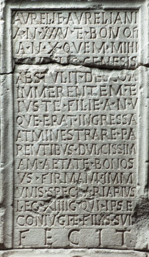 - D(is) i(nferis) M(anibus) / Aureli(a)e Aureliani / a(nnos) n(atae) XXXV et Bono fi(lio) / a(nnos) n(ato) X quem mihi / crudelis Genesis / abstulit de sco[l]a(?) / immerentem et / Iust(a)e fili(a)e a(nnos) n(atae) V / qu(a)e erat ingressa / a<d=T>min<i=E>strare pa/rentibus dulcissim/am aetate(m) Bonos/us Firmani imm/unis speclariarius / leg(ionis) XIIII G(eminae) qui ipse / coniugi et fili(i)s sui[s] / fecit